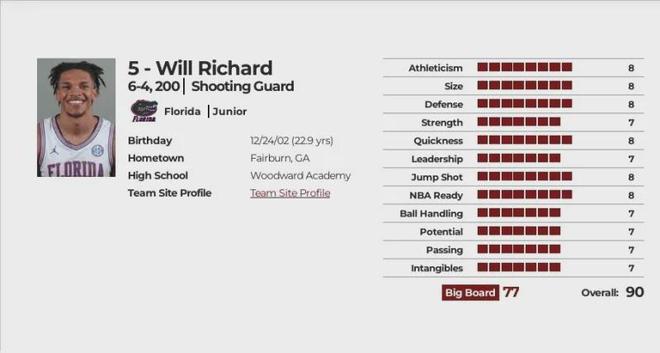 赛季结束,队内的克莱顿二世、亚历克斯-康登、阿利贾-马丁都收到了NBA新秀联合试训邀请,而理查德只收到发展联盟训练营邀请,所以没有他的详细体测报告。