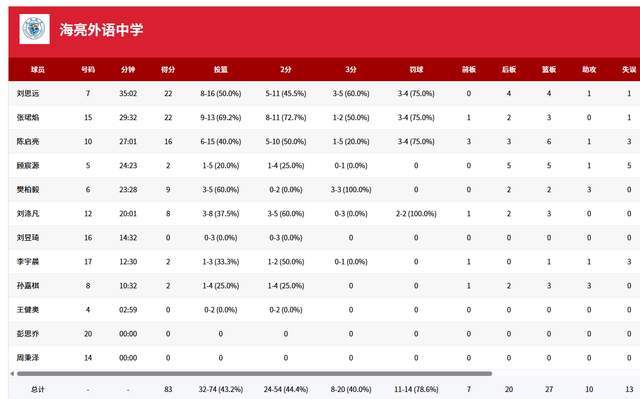 海亮外语中学仅3人得分上双,刘思远21分3篮板,张郡焰22分3篮板,陈启亮16分6篮板。