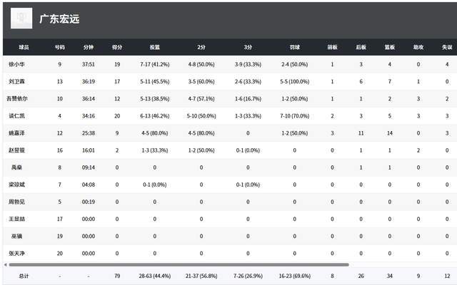 广东宏远此役4人得分上双,谈仁凯13投6中,空砍20分5篮板3助攻,徐小华19分4篮板,刘卫霖17分7篮板,吾赞依尔12分,姚嘉泽9分14篮板。