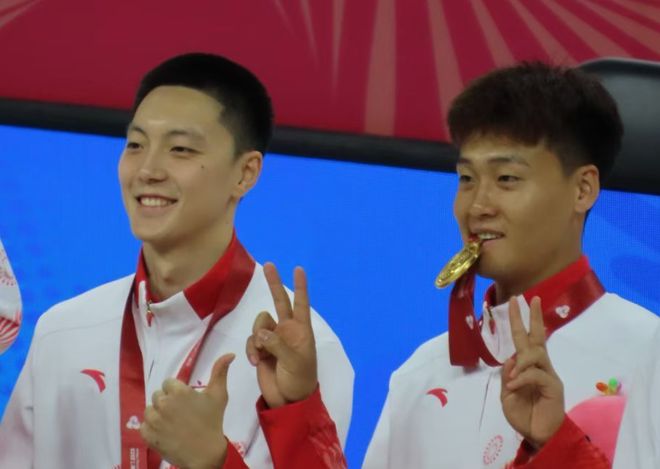 拿到金牌后赵睿还咬了一下这块金牌,赵睿在四年前曾咬过周琦的金牌。