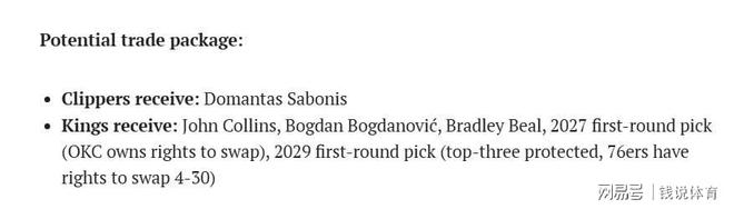 快船是小萨的另一大潜在下家,他们的核心交易筹码在于约翰-科林斯价值2660万美元的到期合同,可与小萨的薪资形成初步匹配。为完成薪资配平,快船还可加入合同仅剩一年的博格丹与赛季报销的比尔,这两位球员的短期合同能让国王获得更多灵活性,进而有理由向快船索要额外选秀权。